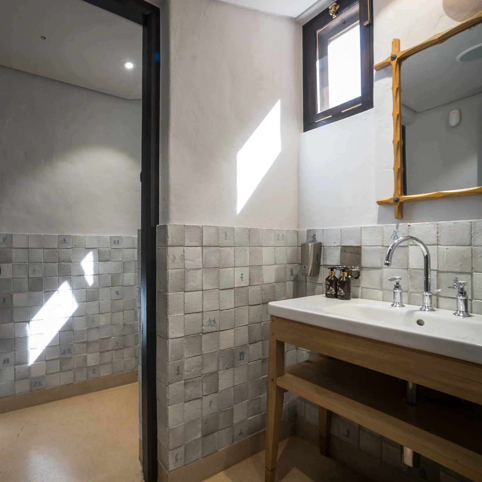 The historic outer shell allowed for high ceiling-ed restaurant areas, bringing volume into spaces that had previously been low ceiling-ed, small, dark rooms. The fireplace alcoves which were once kitchen hearths were restored, all doors and windows were kept and restored, lime plaster was re-applied to the walls which had been wrongly treated with cement plaster previously, and new yellow wood timber floors and ceilings were installed.